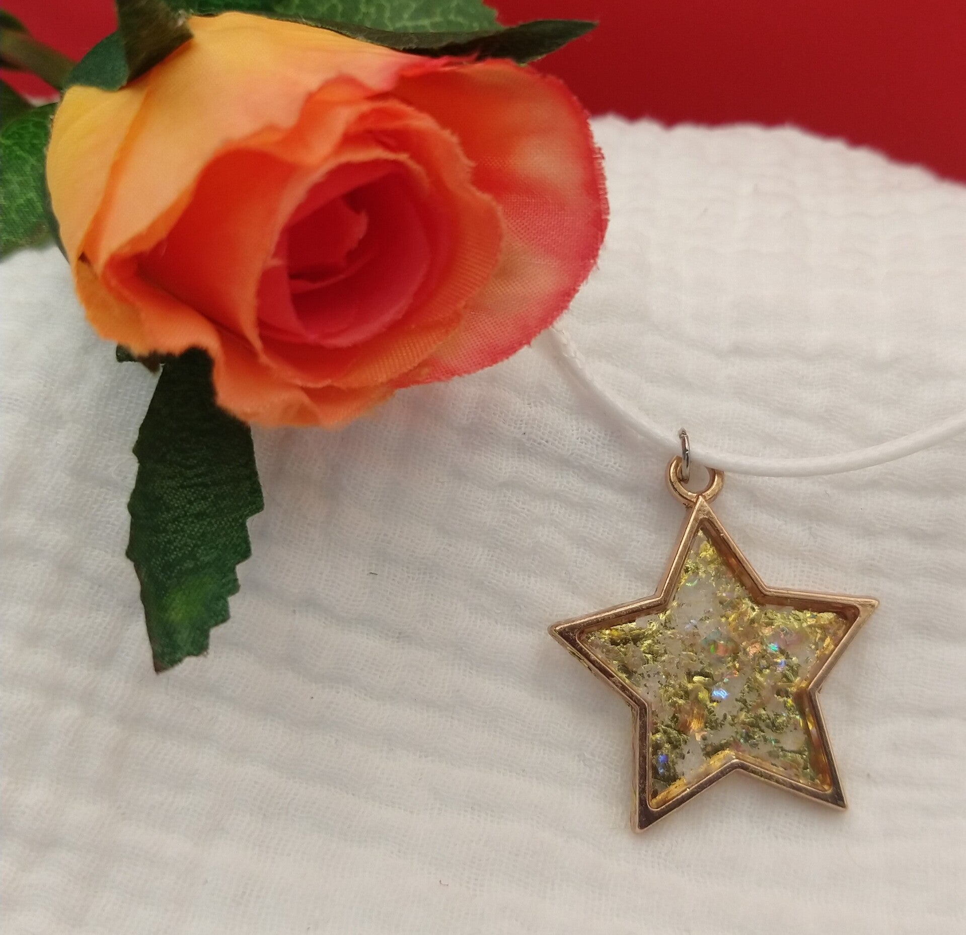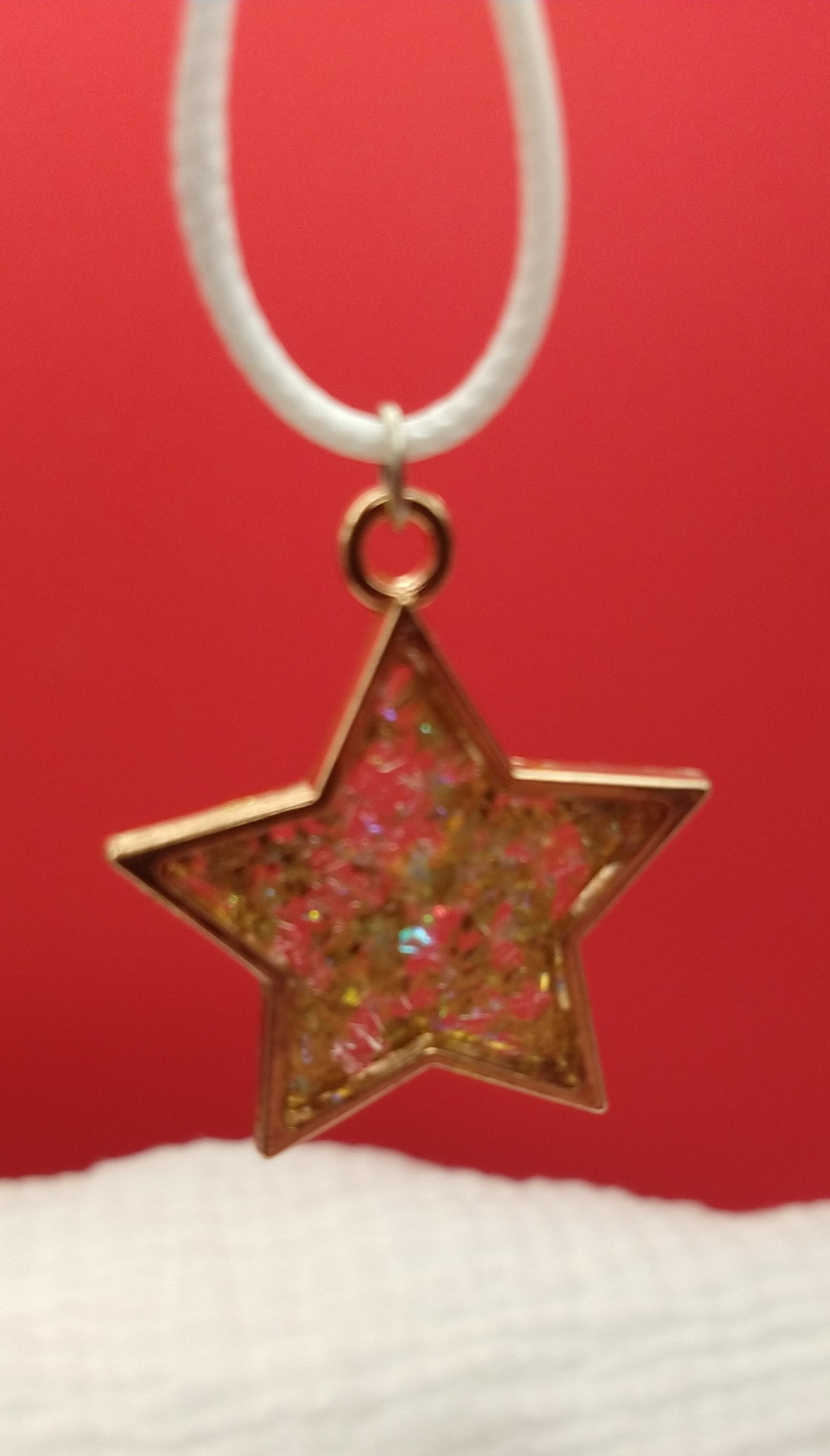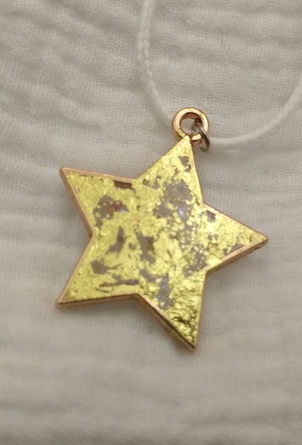 This star has glittery gold and glittery translucent sparkle glass inside. It is especialy pretty if it catches the light and that is why the gold does not cover everything.