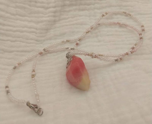 This handbeaded necklace has a stone made with pink epoxy resin made to look like quartz. Excellent as a gift!