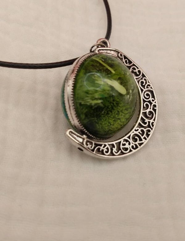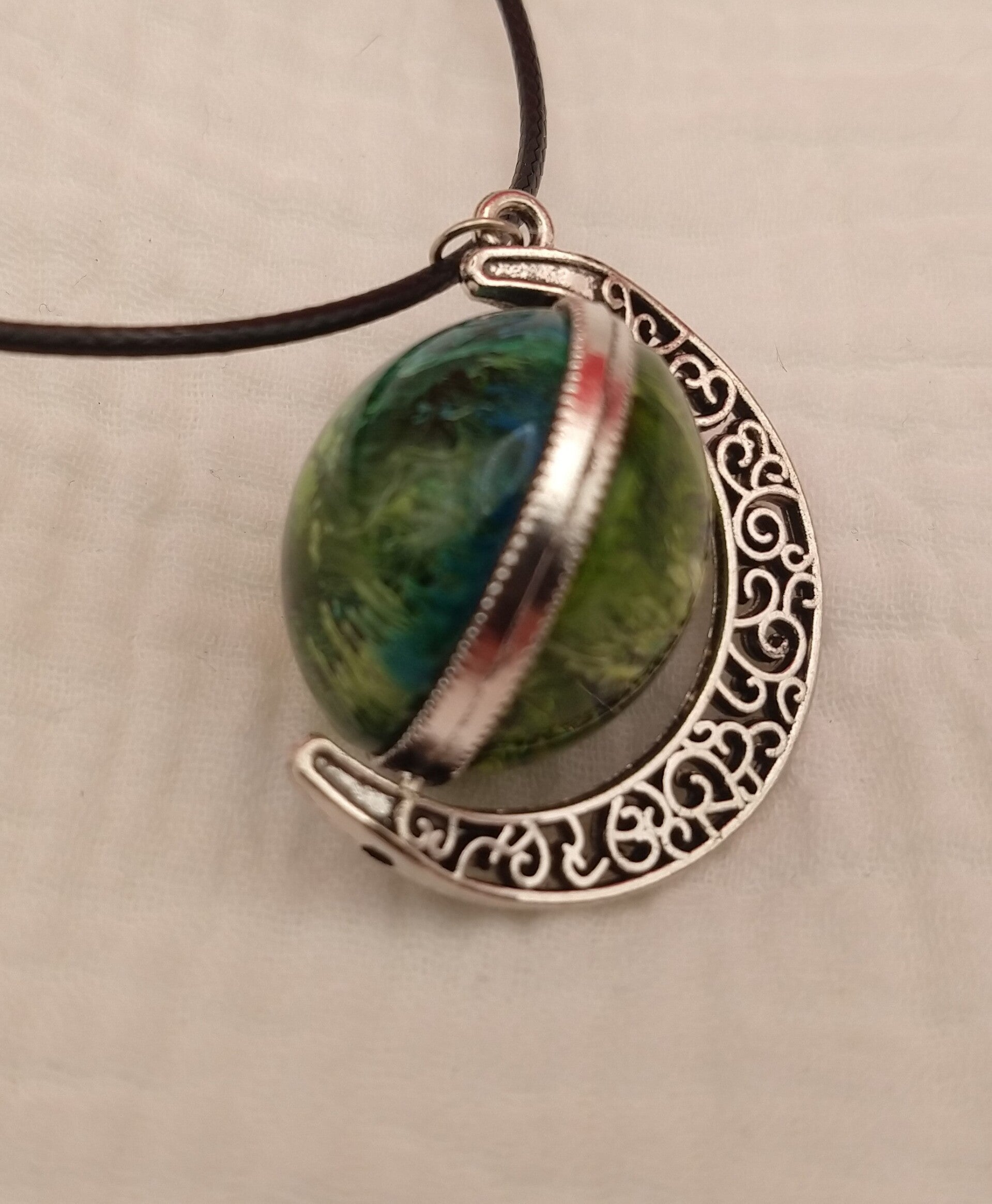 This pendant has two sides that you can turn around. It's like a little planet inside the moon! The two sides are both unique but fit together to look like it's part of a whole.
