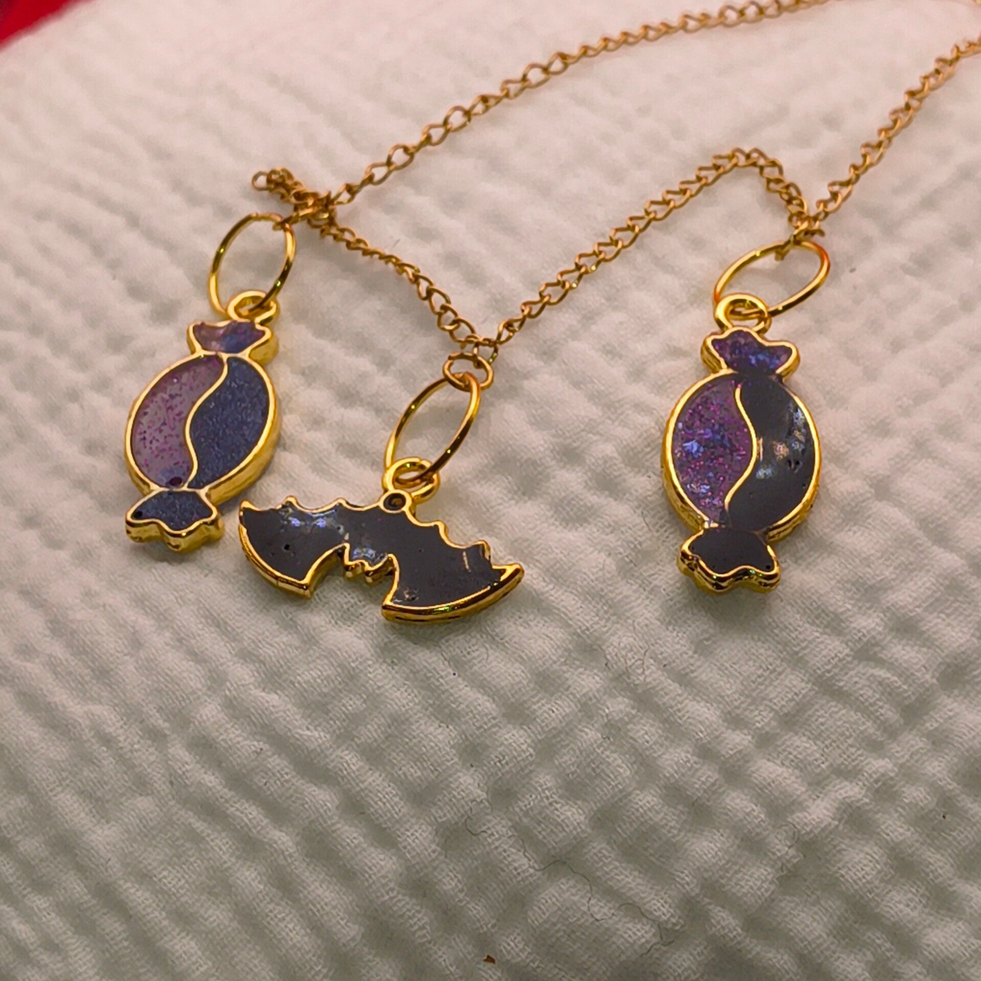 This lovely necklace has not one epoxy emaille hanger but three! Two that are cute candies and one even cuter litte bat. All hanging on a lovely golden chain. Pick it up for next Halloween!